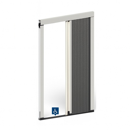 Estas características convierten a este modelo en una opción ideal para puertas de grandes dimensiones, y en especial si ese acceso es transitado por personas con movilidad reducida. El tejido utilizado en estas piezas se pliega de una manera silenciosa sobre sí, hasta donde se requiera en cada momento.